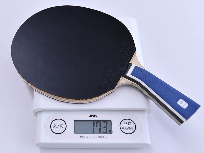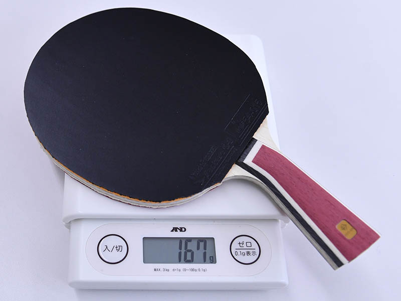 試打を行ったラケットの重量(ラバー含む)は、『テナリー暁炎』が167g、『テナリー蒼天』が173gだった。いずれも、フォア面に『ファスターク G-1』特厚、バック面に『ファスターク C-1』特厚を貼ってその重さなので、かなり軽いということがおわかりいただけるだろう。