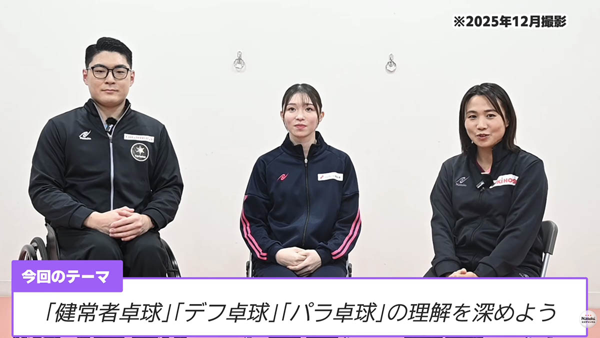 現在、週1投稿にチャレンジ中のニッタク公式YouTubeチャンネル。2/19に公開された動画では、平野早矢香さん(2012年ロンドン五輪団体銀/ニッタクエグゼクティブアドバイザー)がナビゲーターとなり、車いす卓球の七野一輝選手(株式会社オカムラ=24年パリパラリンピック日本代表/ニッタク契約選手)、デフ卓球(ろうあ者卓球)の山田瑞恵選手(SMBC日興証券=25年東京デフリンピック団体銀・複銅/ニッタク契約選手)とのプレー&対談を行っている。